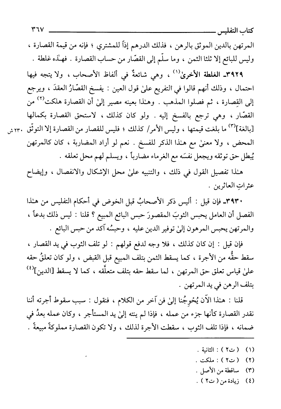 3929 - الغلطة الأخرى (1)، وهي شائعةٌ في ألفاظ الأصحاب، ولا يتجه فيها احتمال، وذلك أنهم قالوا في التفريع على قول العين: يفسخ القصّارُ العقدَ، ويرجع إلى القِصارة، ثم فصلوا المذهب. وهذا بعينه مصير إلى أن القصارة هلكت (2) من القصّار، وهي ترجع بالفسخ إليه. ولو كان كذلك، لاستحق القصارة بكمالها [بالغة] (3) ما بلغت قيمتها، وليس الأمر كذلك؛ فليس للقصار من القصارة إلا التوثّق المحض، ولا معنى مع هذا الذكر للفسخ. نعم لو أراد المضاربة، كان كالمرتهن يُبطل حق توثقه ويجعل نفسَه مع الغرماء مضارباً، ويسلم لهم محل تعلقه.