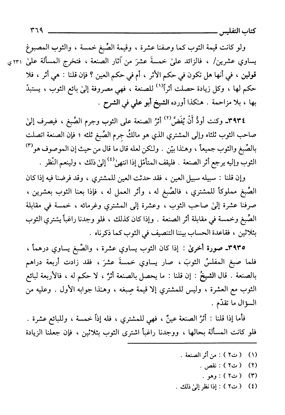 3934 - وكنت أودّ أَنْ يُفَضَّ (2) أثرُ الصنعة على الثوب وجرم الصَّبغ، فيصرف إلى صاحب الثوب ثلثاه وإلى المشتري الذي هو مالكُ جِرم الصَّبغ ثلثه؛ فإن الصنعة اتصلت بالصَّبغ والثوب جميعاً، وهذا بيّن. ولكن لعله قال ما قال من حيث إن الموصوف هو (3) الثوب وإليه يرجع أثر الصنعة. فليقف المتأمّل إذا انتهى (4) إلى ذلك، ولينعم النّظر.