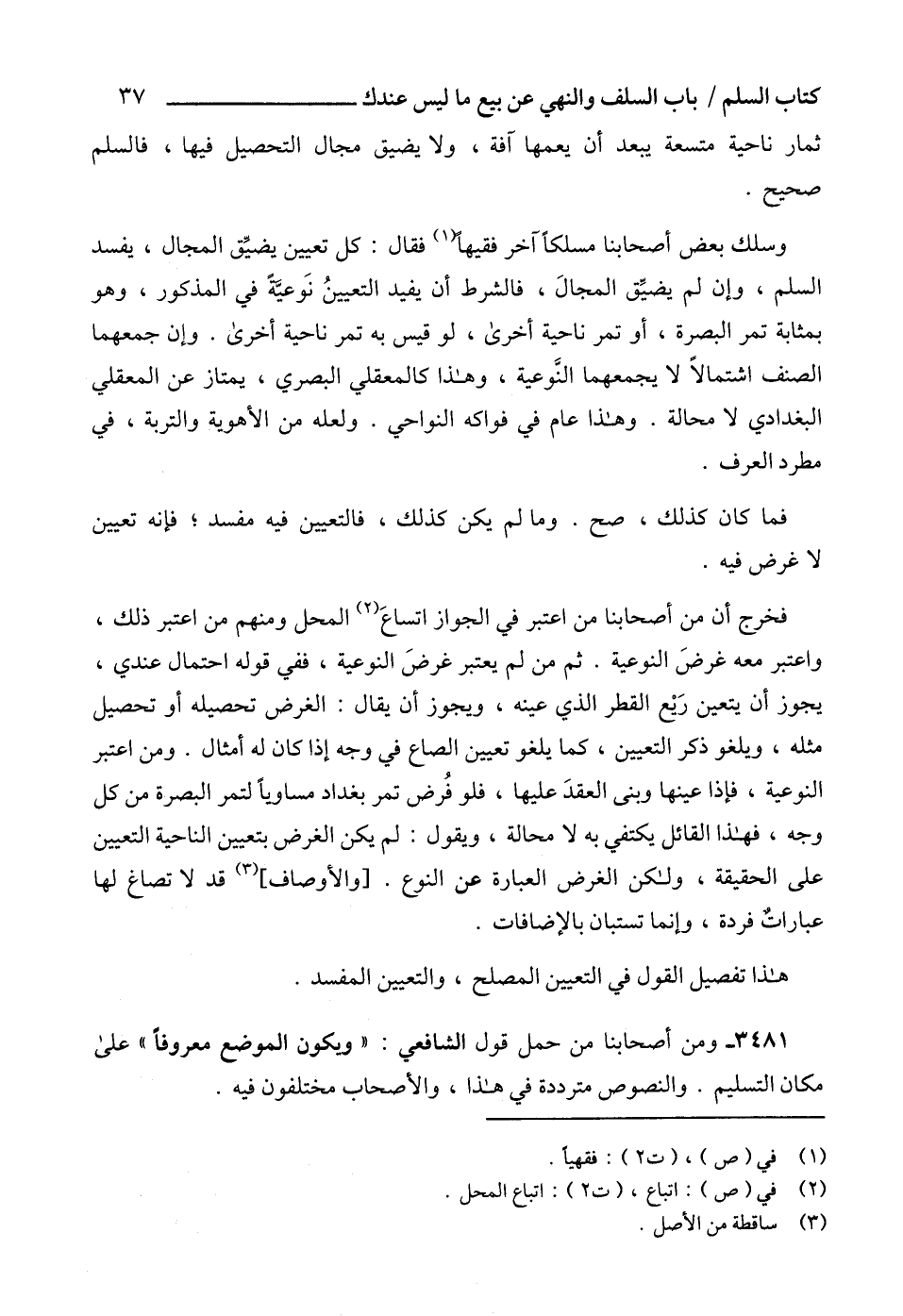 وسلك بعض أصحابنا مسلكاً آخر فقيهاً (1) فقال: كل تعيين يضيِّق المجال، يفسد السلم، وإن لم يضيِّق المجالَ، فالشرط أن يفيد التعيينُ نَوعيَّةً في المذكور، وهو بمثابة تمر البصرة، أو تمر ناحية أخرى، لو قيس به تمر ناحية أخرى. وإن جمعهما الصنف اشتمالاً لا يجمعهما النَّوعية، وهذا كالمعقلي البصري، يمتاز عن المعقلي البغدادي لا محالة. وهذا عام في فواكه النواحي. ولعله من الأهوية والتربة، في مطرد العرف.