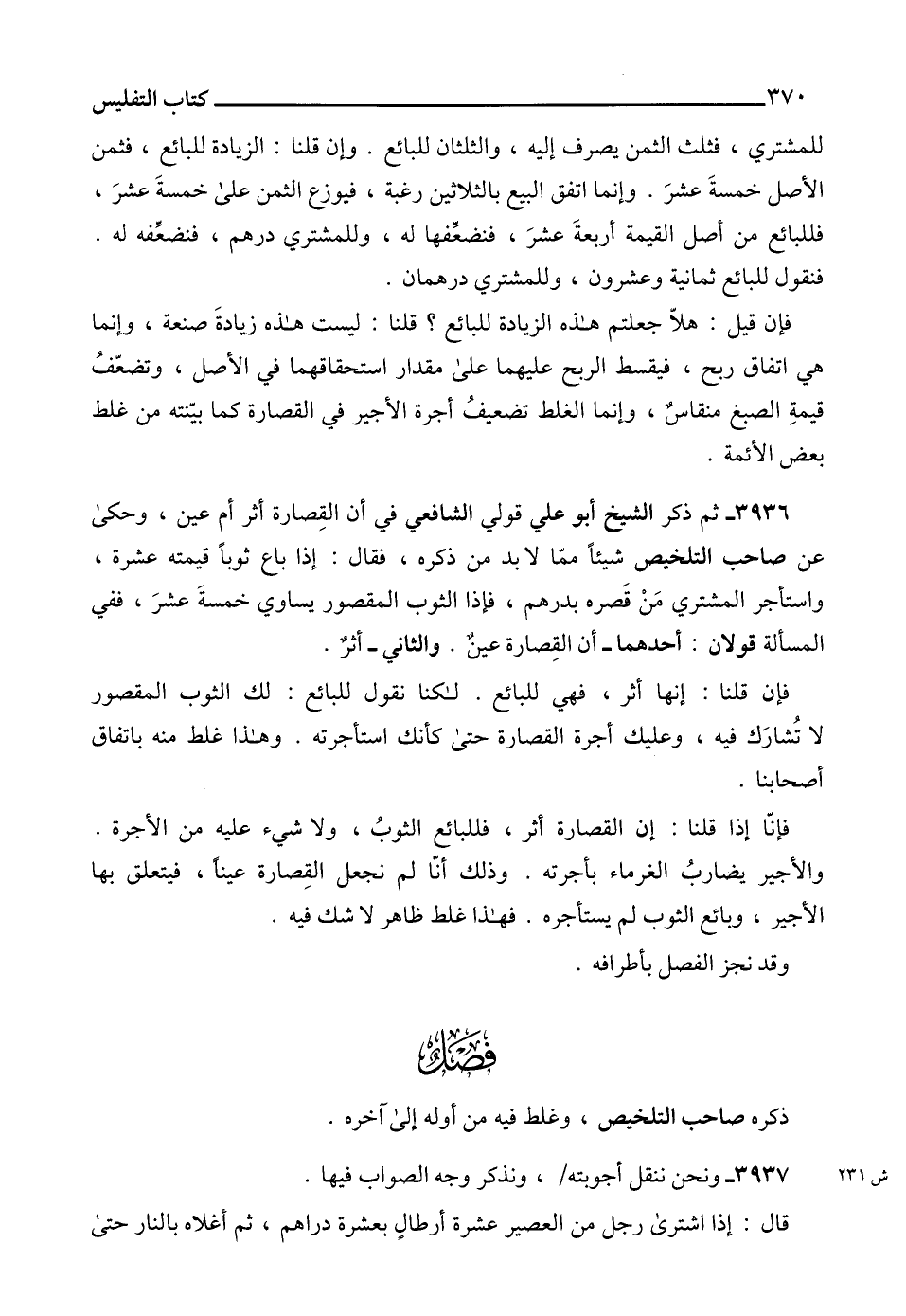 3936 - ثم ذكر الشيخ أبو علي قولي الشافعي في أن القِصارة أثر أم عين، وحكى عن صاحب التلخيص شيئاًً ممّا لا بد من ذكره، فقال: إذا باع ثوباًً قيمته عشرة، واستأجر المشتري مَنْ قَصره بدرهم، فإذا الثوب المقصور يساوي خمسةَ عشرَ، ففي المسألة قولان: أحدهما - أن القِصارة عينٌ. والثاني - أثرٌ.