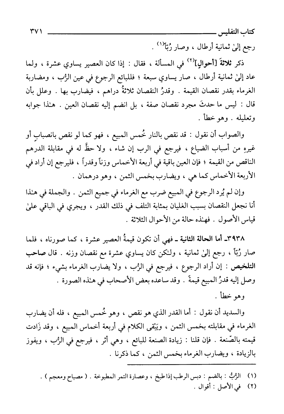 ذكر ثلاثة [أحوالٍ] (2) في المسألة، فقال: إذا كان العصير يساوي عشرة، ولما عاد إلى ثمانية أرطال، صار يساوي سبعة؛ فللبائع الرجوع في عين الرُّب، ومضاربة الغرماء بقدر نقصان القيمة. وقدرُ النقصان ثلاثةُ دراهم، فيضارب بها. وعلل بأن قال: ليس ما حدثَ مجرد نقصان صفة، بل انضم إليه نقصان العين. هذا جوابه وتعليله. وهو خطأ.