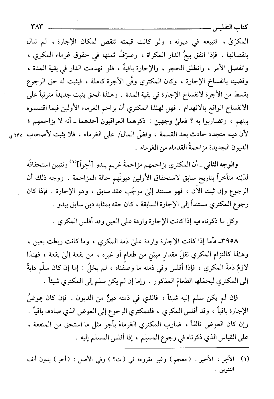 والوجه الثاني - أن المكتري يزاحمهم مزاحمةَ غريم يبدو [أخِراً] (1) ونتبين استحقاقَه لدَيْنه متأخراً بتاريخ سابق لاستحقاق الأولين ديونَهم حالة المزاحمة. ووجه ذلك أن الرجوع وإن ثبت الآن، فهو مستند إلى موجَب عقد سابق، وهو الإجارة. فإذا كان رجوع المكتري مستنداً إلى الإجارة السابقة، كان حقه بمثابة دين سابق يبدو.