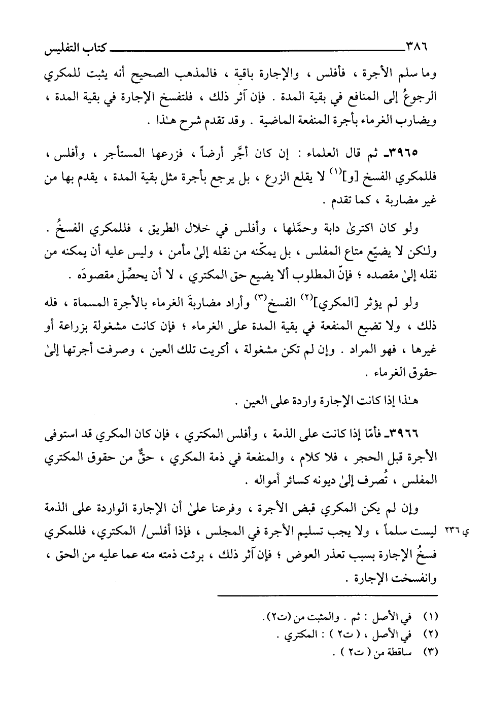 3966 - فأمّا إذا كانت على الذمة، وأفلس المكتري، فإن كان المكري قد استوفى الأجرة قبل الحجر، فلا كلام، والمنفعة في ذمة المكري، حقٌّ من حقوق المكتري المفلس، تُصرف إلى ديونه كسائر أمواله.