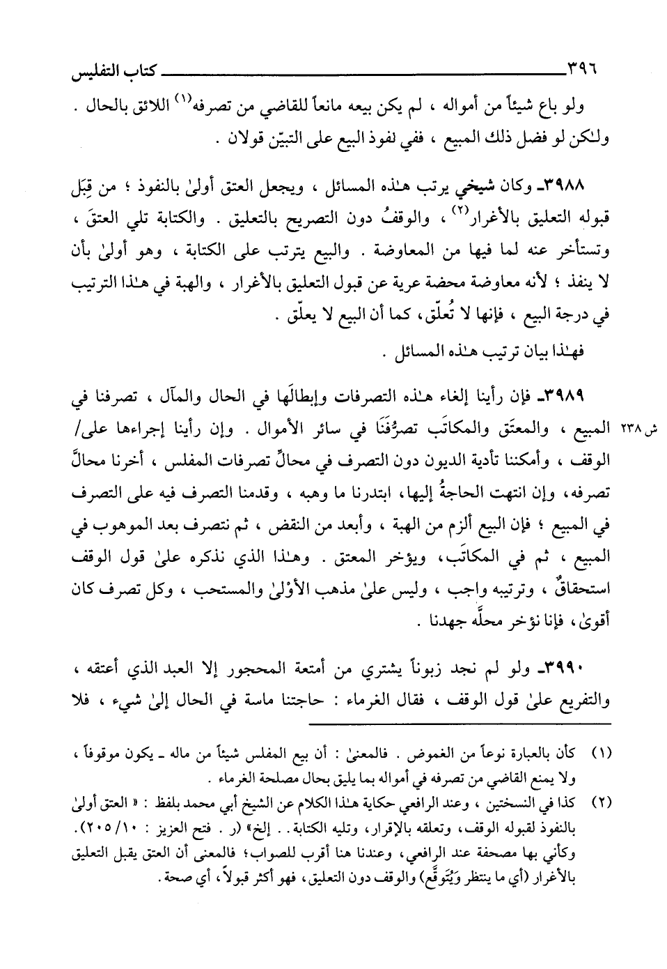 3988 - وكان شيخي يرتب هذه المسائل، ويجعل العتق أولى بالنفوذ، من قِبَل قبوله التعليق بالأغرار (2)، والوقفُ دون التصريح بالتعليق. والكتابة تلي العتقَ، وتستأخر عنه لما فيها من المعاوضة. والبيع يترتب على الكتابة، وهو أولى بأن لا ينفذ؛ لأنه معاوضة محضة عرية عن قبول التعليق بالأغرار، والهبة في هذا الترتيب في درجة البيع، فإنها لا تُعلّق، كما أن البيع لا يعلّق.