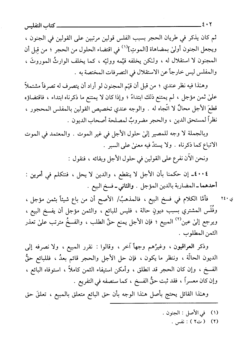 وهذا فيه نظر عندي؛ من قبل أن قيّم المجنون لو أراد أن يتصرف له تصرفاً مشتملاً على ثمن مؤجل، لم يمتنع ذلك ابتداءً؛ وإذا كان لا يمتنع ما ذكرناه ابتداء، فاقتضاؤه قطعَ الأجل محالٌ لا اتّجاه له. والوجه عندي تخصيص القولين بالمفلس المحجور، نظراً لمستحق الدين، والحجر مضروبٌ لمصلحة أصحاب الديون.