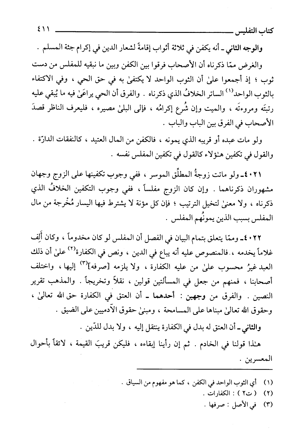 4021 - ولو ماتت زوجةُ المطلِّق الموسر، ففي وجوب تكفينها على الزوج وجهان مشهوران ذكرناهما. وإن كان الزوج مفلساً، ففي وجوب التكفين الخلافُ الذي ذكرناه، ولا معنى لتخيل الترتيب؛ فإن كل مؤنة لا يشترط فيها اليسار مُخْرجة من مال المفلس بسبب الذين يمونُهم المفلس.