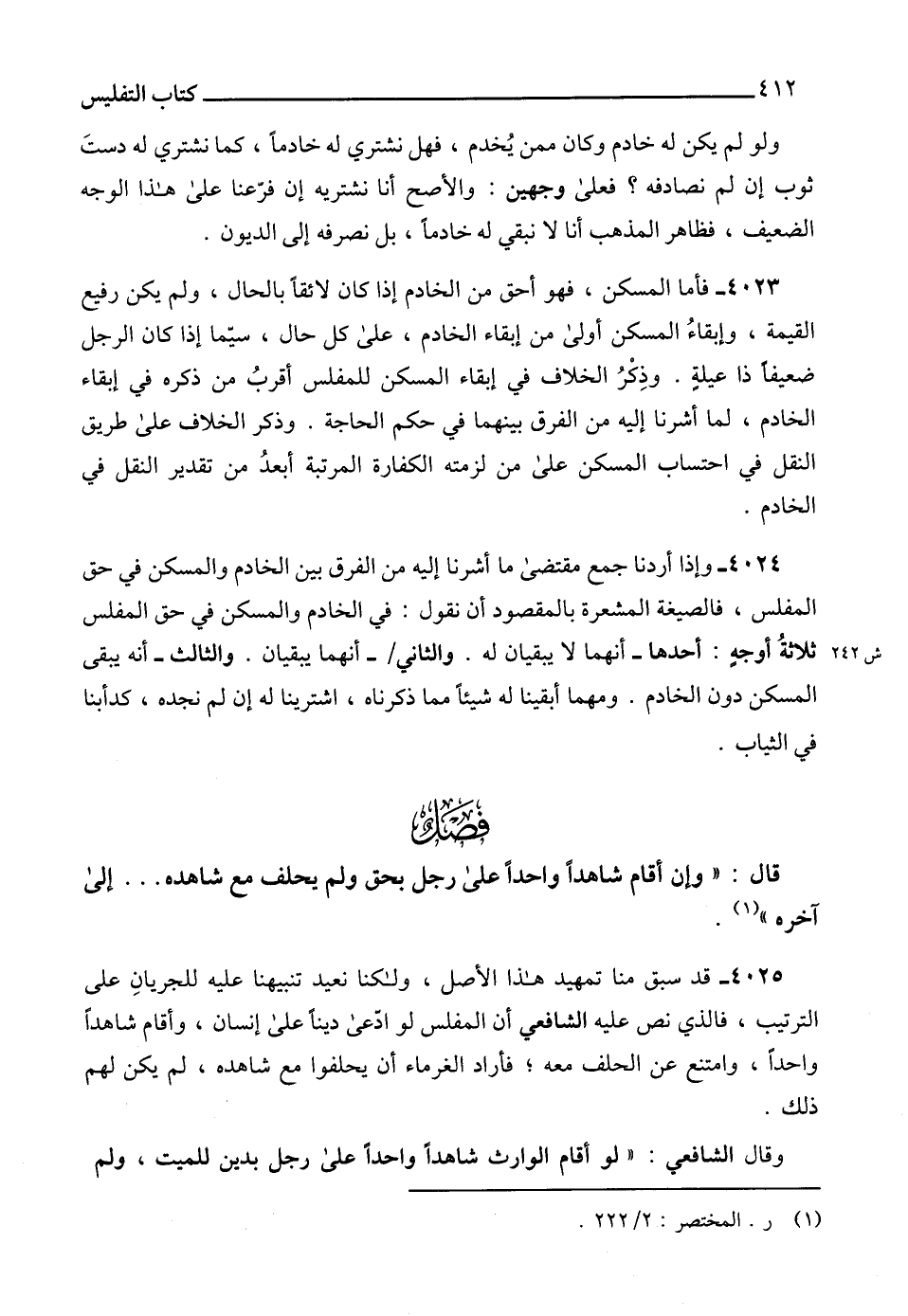 4024 - وإذا أردنا جمع مقتضى ما أشرنا إليه من الفرق بين الخادم والمسكن في حق المفلس، فالصيغة المشعرة بالمقصود أن نقول: في الخادم والمسكن في حق المفلس ثلاثةُ أوجهٍ: أحدها - أنهما لا يبقيان له. والثاني - أنهما يبقيان. والثالث - أنه يبقى المسكن دون الخادم. ومهما أبقينا له شيئاًً مما ذكرناه، اشترينا له إن لم نجده، كدأبنا في الثياب.
