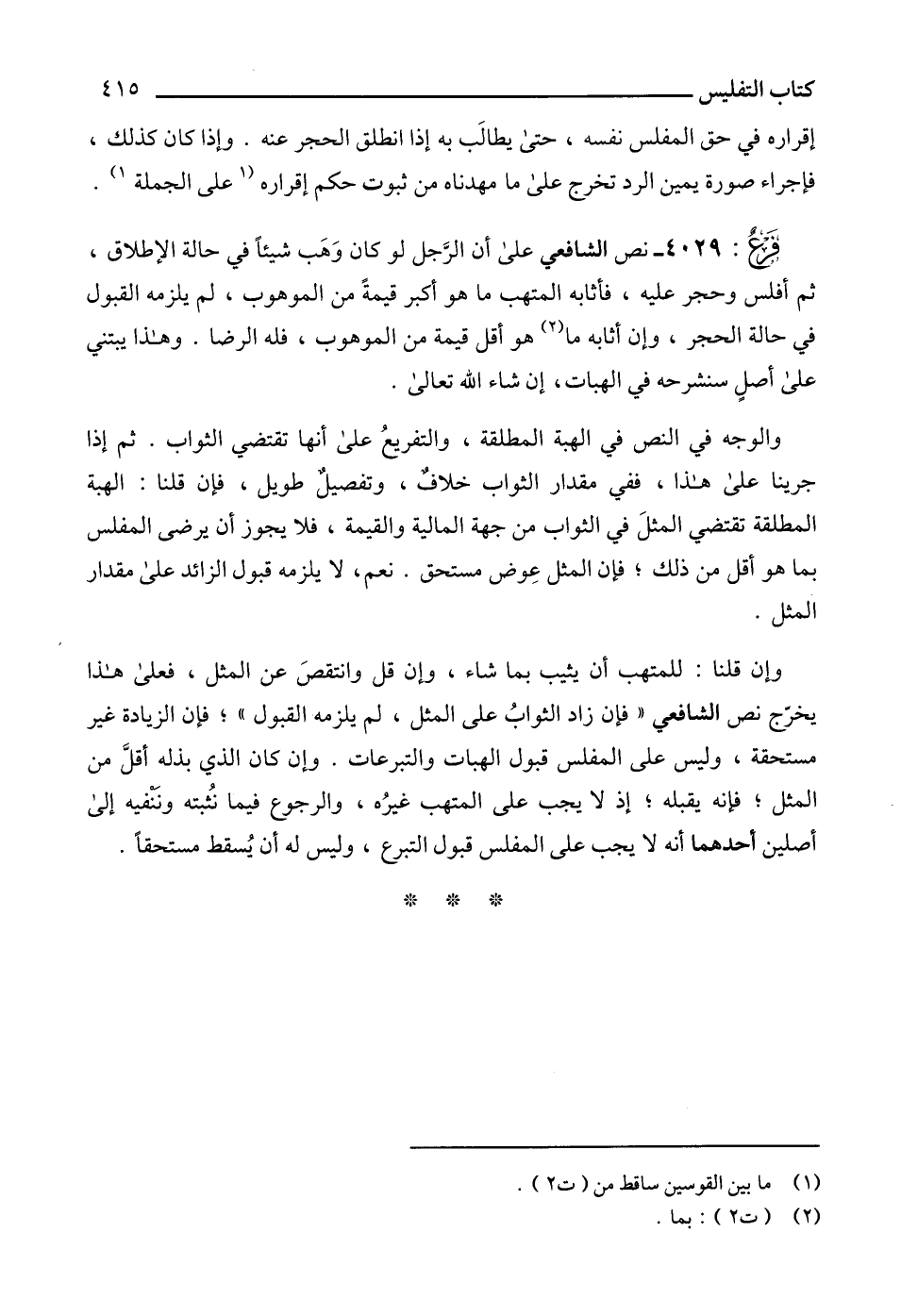 4029 - نص الشافعي على أن الرَّجل لو كان وَهَب شيئاًً في حالة الإطلاق، ثم أفلس وحجر عليه، فأثابه المتهب ما هو أكبر قيمةً من الموهوب، لم يلزمه القبول في حالة الحجر، وإن أثابه ما (2) هو أقل قيمة من الموهوب، فله الرضا. وهذا يبتني على أصلٍ سنشرحه في الهبات، إن شاء الله تعالى.