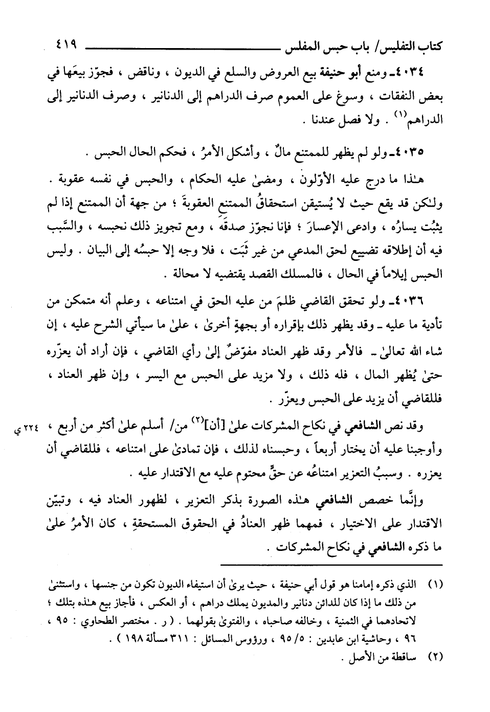 (1) الذي ذكره إمامنا هو قول أبي حنيفة، حيث يرى أن استيفاء الديون تكون من جنسها، واستثنى من ذلك ما إذا كان للدائن دنانير والمديون يملك دراهم، أو العكس، فأجاز بيع هذه بتلك؛ لاتحادهما في الثمنية، وخالفه صاحباه، والفتوى بقولهما. (ر. مختصر الطحاوي: 95، 96، وحاشية ابن عابدين: 5/ 95، ورؤوس المسائل: 311 مسألة 198).