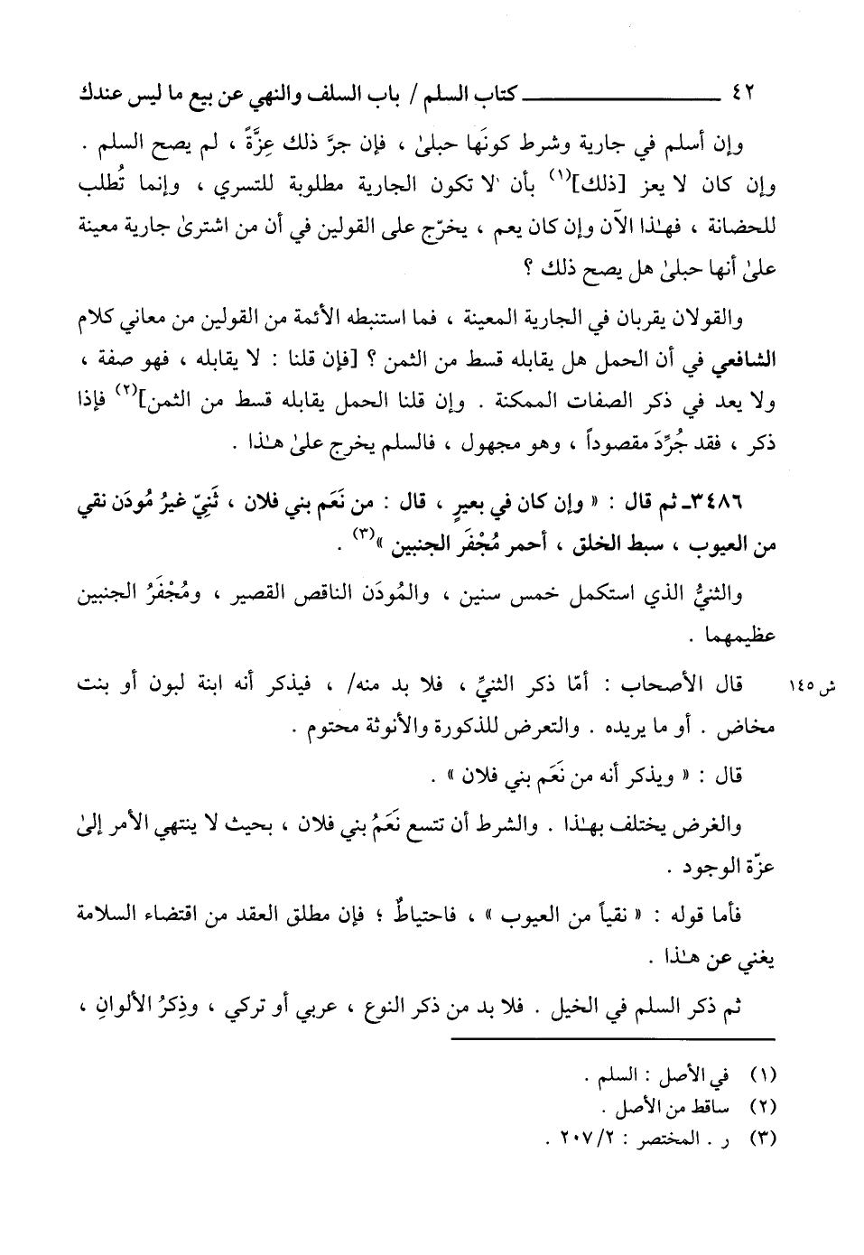 ثم ذكر السلم في الخيل. فلا بد من ذكر النوع، عربي أو تركي، وذِكرُ الألوانِ،