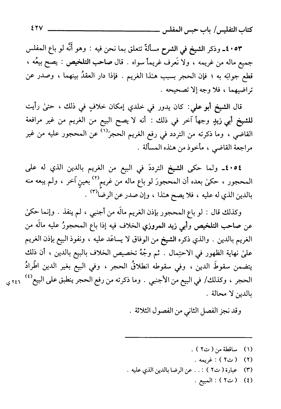4053 - وذكر الشيخ في الشرح مسألةً تتعلق بما نحن فيه: وهو أَنَّه لو باع المفلس جميع ماله من غريمه، ولا نَعرف غريماً سواه. قال صاحب التلخيص: يصح بيعُه، قطع جوابَه به؛ فإن الحجر بسبب هذا الغريم. فإذا دار العقدُ بينهما، وصدر عن تراضيهما، فلا وجه إلا تصحيحه.