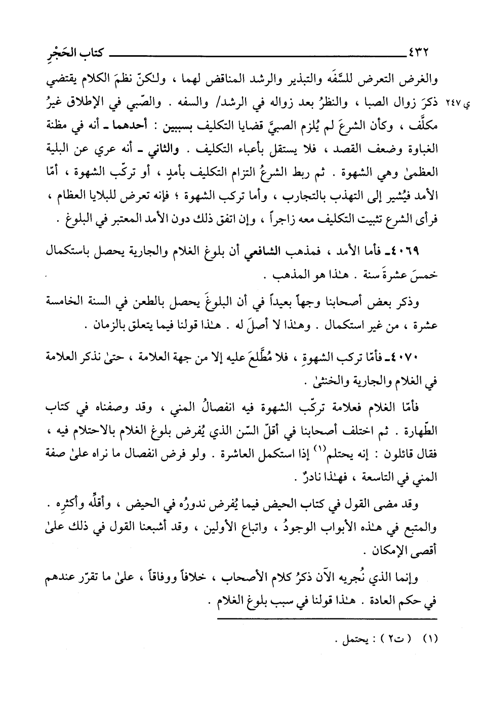 4069 - فأما الأمد، فمذهب الشافعي أن بلوغ الغلام والجارية يحصل باستكمال خمسَ عشرةَ سنة. هذا هو المذهب.