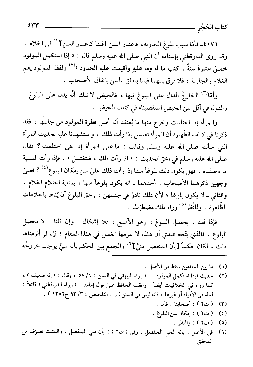 وقد روى الدارقطني بإسناده أن النبي صلى الله عليه وسلم قال: " إذا استكمل المولود خمسَ عشرةَ سنةً، كتب ما له وما عليهِ وأقيمت عليه الحدود " (2) ولفظ المولود يعم الغلام والجارية، فلا فرق بينهما فيما يتعلق بالسن باتفاق الأصحاب.