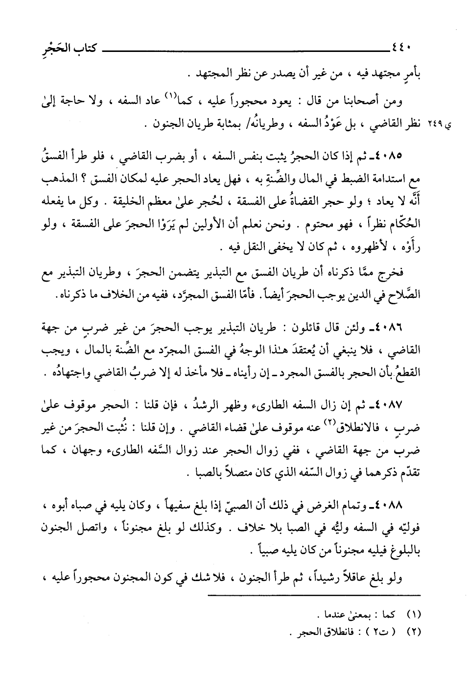 4085 - ثم إذا كان الحجرُ يثبت بنفس السفه، أو بضرب القاضي، فلو طرأ الفسقُ مع استدامة الضبط في المال والضِّنةِ به، فهل يعاد الحجر عليه لمكان الفسق؟ المذهب أَنَّه لا يعاد؛ ولو حجر القضاةُ على الفسقة، لحُجر على معظم الخليقة. وكل ما يفعله الحُكّام نظراً، فهو محتوم. ونحن نعلم أن الأولين لم يَرَوْا الحجرَ على الفسقة، ولو رأَوْه، لأظهروه، ثم كان لا يخفى النقل فيه.