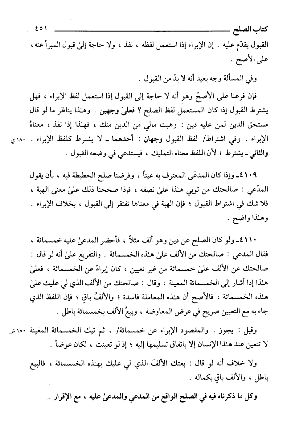 4109 - وإذا كان المدعَى المعترف به عيناً، وفرضنا صلح الحطيطة فيه، بأن يقول المدّعي: صالحتك من ثوبي هذا على نصفه، فإذا صححنا ذلك على معنى الهبة، فلا شك في اشتراط القبول؛ فإن الهبة في معناها تفتقر إلى القبول، بخلاف الإبراء. وهذا واضح.