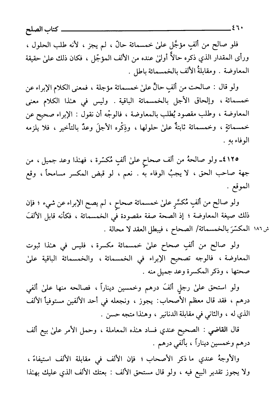4125 - ولو صالحهُ من ألف صحاحٍ على ألفٍ مُكسّرة، فهذا وعد جميل، من جهة صاحب الحق، لا يجبُ الوفاء به. نعم، لو قبض المكسر مسامحاً، وقع الموقع.