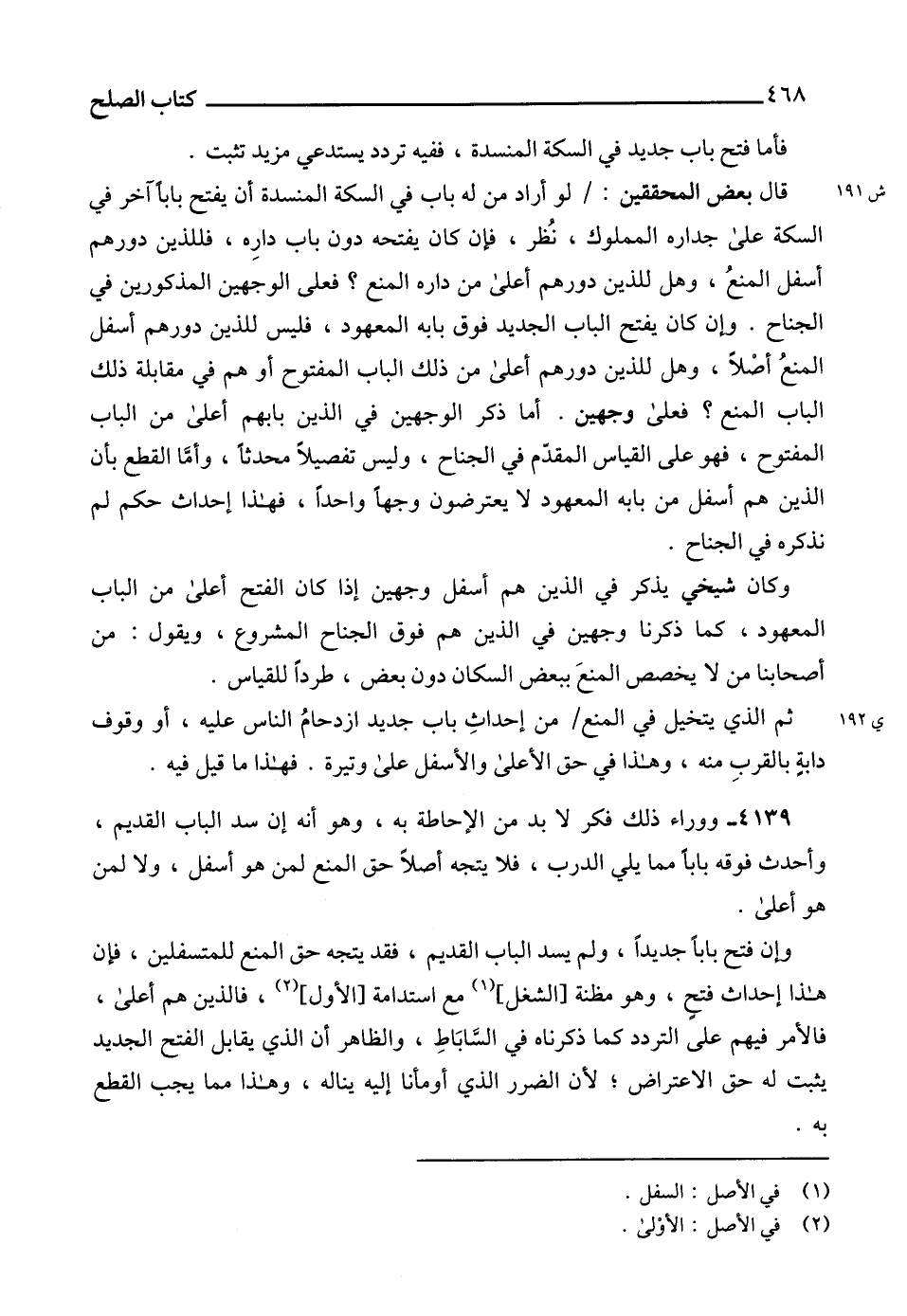 4139 - ووراء ذلك فكر لا بد من الإحاطة به، وهو أنه إن سد الباب القديم، وأحدث فوقه باباً مما يلي الدرب، فلا يتجه أصلاً حق المنع لمن هو أسفل، ولا لمن هو أعلى.
