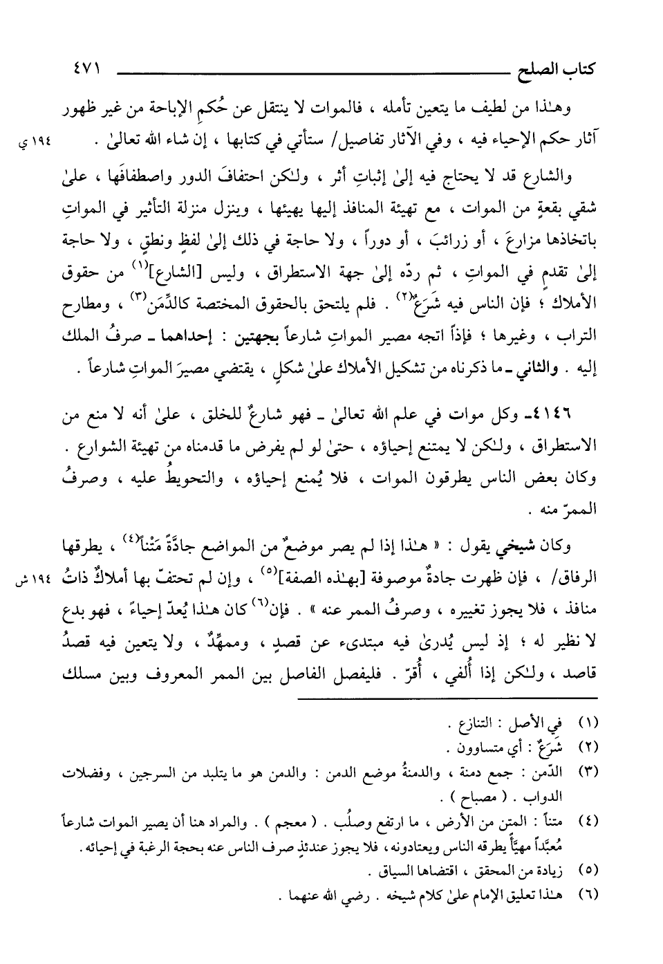 (4) متناً: المتن من الأرض، ما ارتفع وصلُب. (معجم). والمراد هنا أن يصير الموات شارعاً مُعبَّداً مهيَّاً يطرقه الناس ويعتادونه، فلا يجوز عندئذٍ صرف الناس عنه بحجة الرغبة في إحيائه.