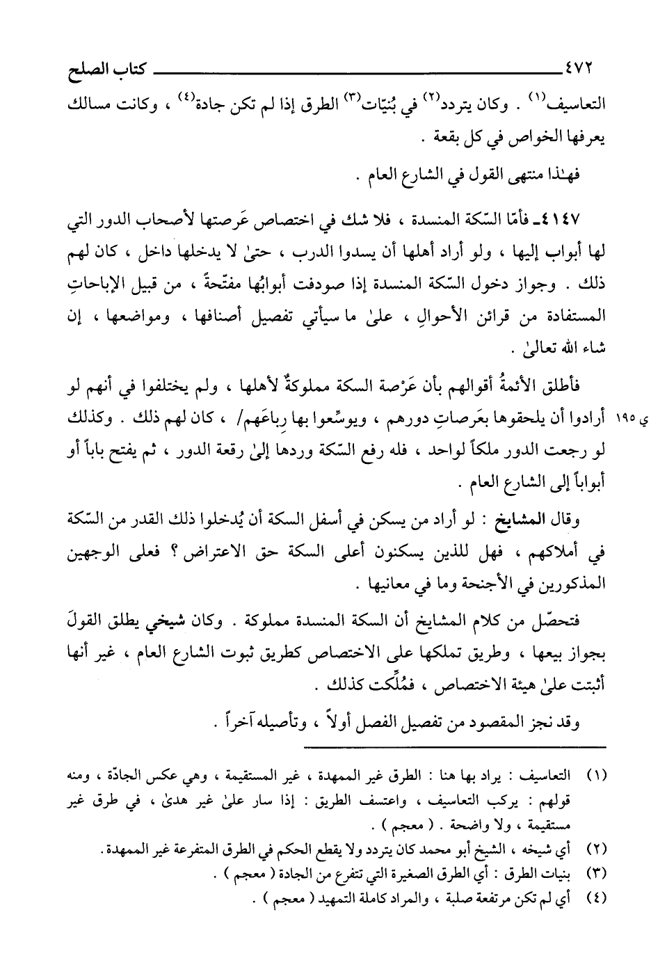 4147 - فأمّا السّكة المنسدة، فلا شك في اختصاص عَرصتها لأصحاب الدور التي لها أبواب إليها، ولو أراد أهلها أن يسدوا الدرب، حتى لا يدخلها داخل، كان لهم ذلك. وجواز دخول السّكة المنسدة إذا صودفت أبوابُها مفتّحةً، من قبيل الإباحاتِ المستفادة من قرائن الأحوالِ، على ما سيأتي تفصيل أصنافها، ومواضعها، إن شاء الله تعالى.
