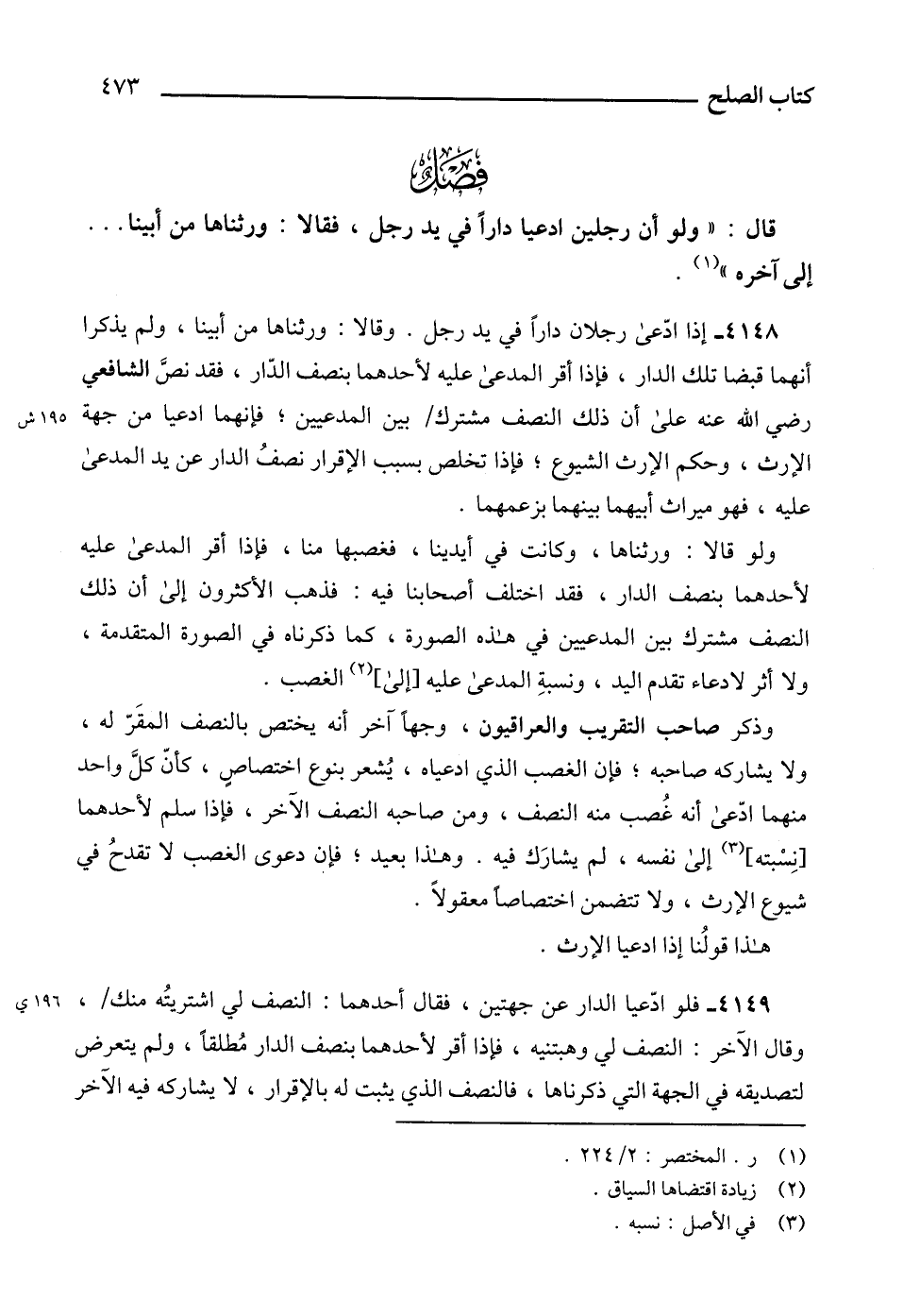 4148 - إذا ادّعى رجلان داراً في يد رجل. وقالا: ورثناها من أبينا، ولم يذكرا أنهما قبضا تلك الدار، فإذا أقر المدعى عليه لأحدهما بنصف الدّار، فقد نصَّ الشافعي رضي الله عنه على أن ذلك النصف مشترك بين المدعيين، فإنهما ادعيا من جهة الإرث، وحكم الإرث الشيوع، فإذا تخلص بسبب الإقرار نصفُ الدار عن يد المدعى عليه، فهو ميراث أبيهما بينهما بزعمهما.