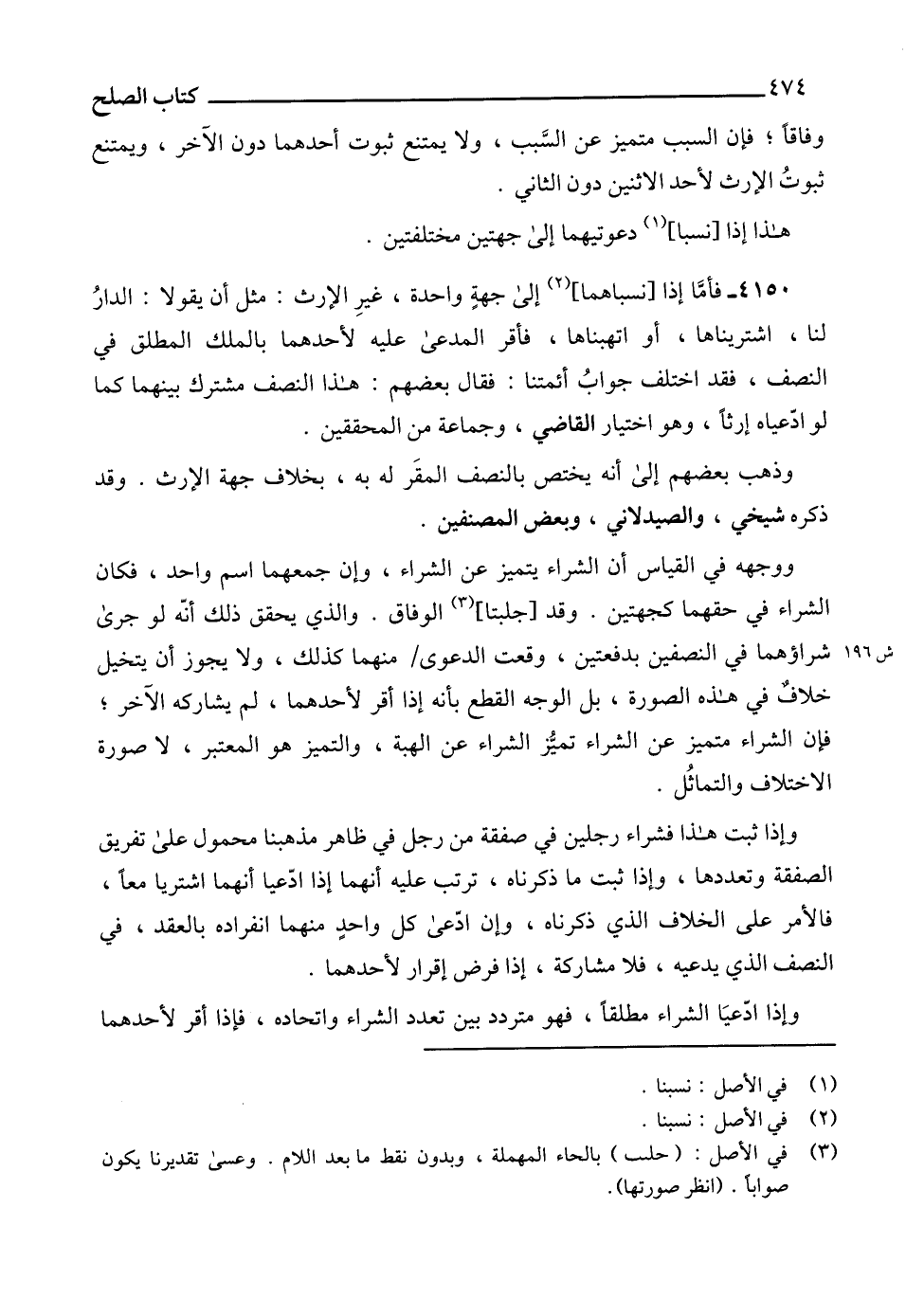 4150 - فأمَّا إذا [نسباهما] (2) إلى جهةٍ واحدة، غيرِ الإرث: مثل أن يقولا: الدارُ لنا، اشتريناها، أو اتهبناها، فأقر المدعى عليه لأحدهما بالملك المطلق في النصف، فقد اختلف جوابُ أئمتنا: فقال بعضهم: هذا النصف مشترك بينهما كما لو ادّعياه إرثاً، وهو اختيار القاضي، وجماعة من المحققين.