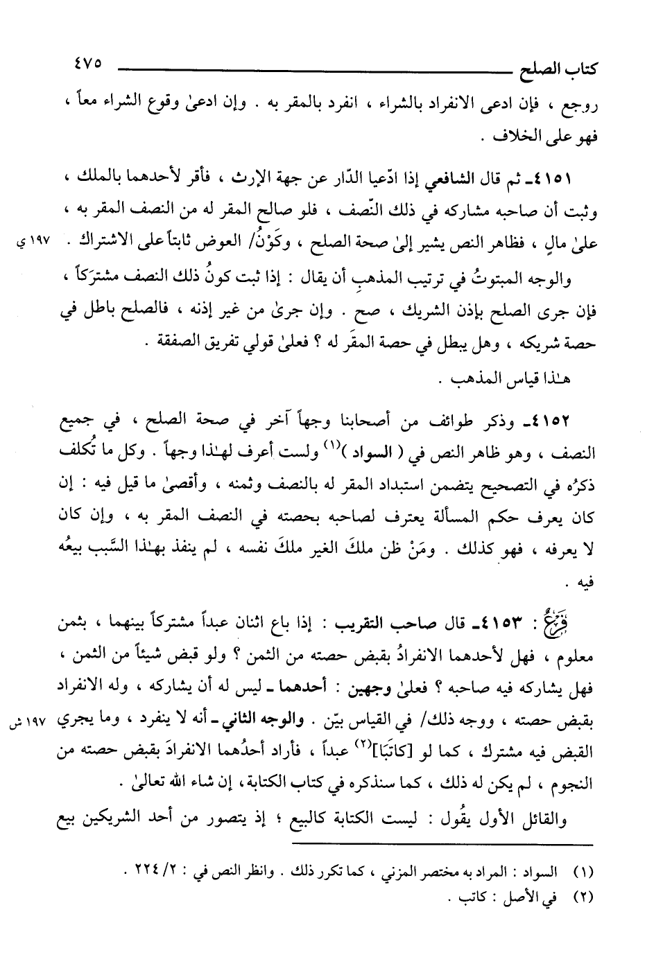 4152 - وذكر طوائف من أصحابنا وجهاً آخر في صحة الصلح، في جميع النصف، وهو ظاهر النص في (السواد) (1) ولست أعرف لهذا وجهاًً. وكل ما تُكلف ذكرُه في التصحيح يتضمن استبداد المقر له بالنصف وثمنه، وأقصى ما قيل فيه: إن كان يعرف حكم المسألة يعترف لصاحبه بحصته في النصف المقر به، وإن كان لا يعرفه، فهو كذلك. ومَنْ ظن ملكَ الغير ملكَ نفسه، لم ينفذ بهذا السَّبب بيعُه فيه.