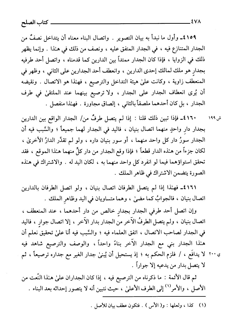 4159 - وأول ما نبدأ به بيان التصوير. واتصال البناء معناه أن يتداخل نصفٌ من الجدار المتنازع فيه، في الجدار المتفق عليه، ونصف من ذلك في هذا. وإنما يظهر ذلك في الزوايا، فإذا كان الجدار ممتداً بين الدارين كما قدمناه، واتصل أحد طرفيه بجدارٍ هو ملك لمالك إحدى الدارين، وانعطف أحد الجدارين على الثاني، وظهر في المنعطف زاوية، وكانت على هيئة التداخل والترصيع، فهذا هو الاتصال. ونقيضه أن يُرى انعطاف الجدار على الجدار، ولا ترصيع بينهما عند الملتقى في طرف الجدار، بل كان أحدهما ملصقاً بالثاني، إلصاق مجاورة. فهذا منفصل.