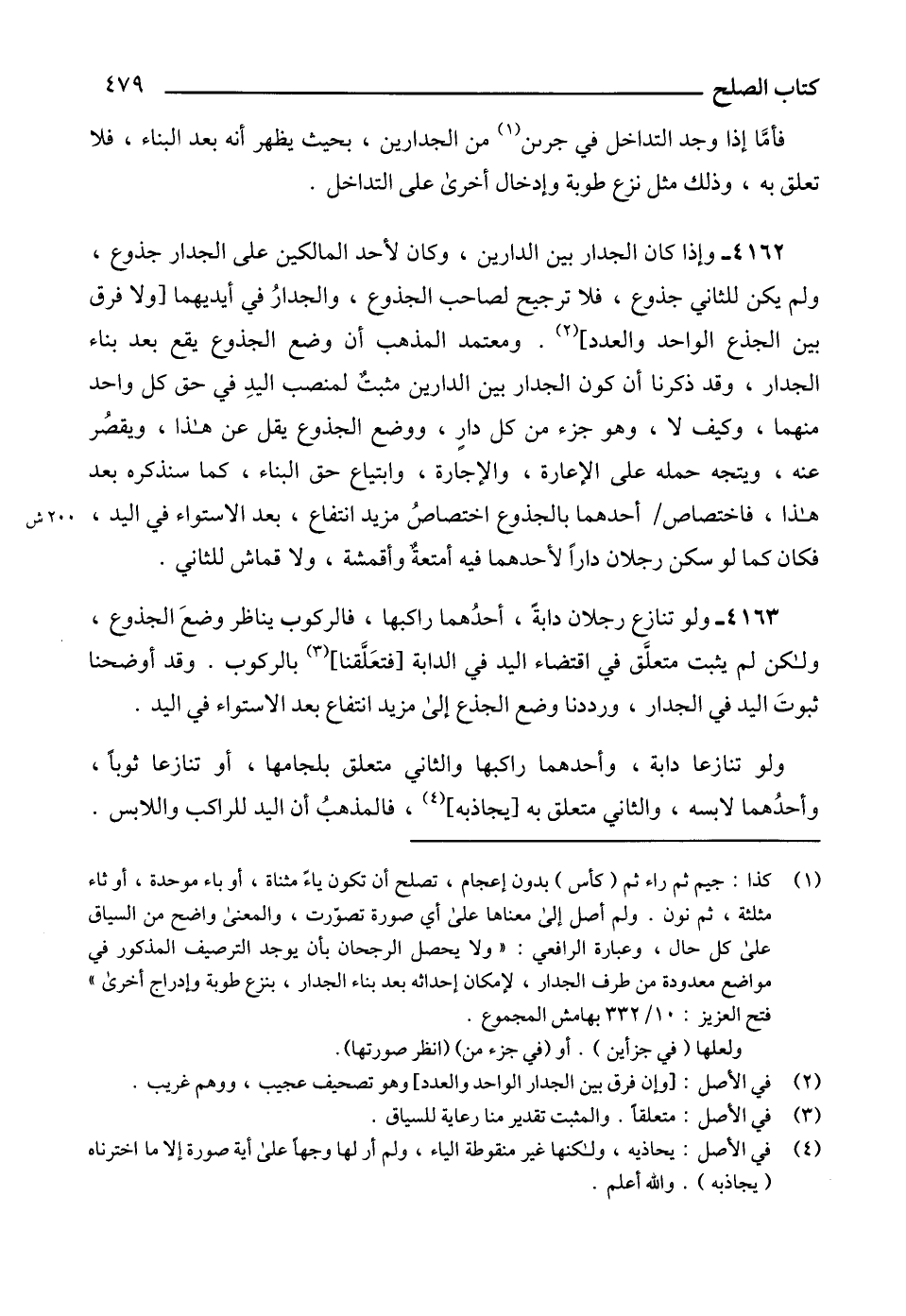 (1) كذا: جيم ثم راء ثم (كأس) بدون إعجام، تصلح أن تكون ياءً مثناة، أو باء موحدة، أو ثاء مثلثة، ثم نون. ولم أصل إلى معناها على أي صورة تصوّرت، والمعنى واضح من السياق على كل حال، وعبارة الرافعي: "ولا يحصل الرجحان بأن يوجد الترصيف المذكور في مواضع معدودة من طرف الجدار، لإمكان إحداثه بعد بناء الجدار، بنزع طوبة وإدراج أخرى" فتح العزيز: 10/ 332 بهامش المجموع.