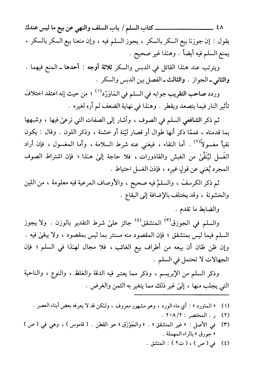 يقول: إن جوزنا بيع السكر بالسكر، يجوز السلم فيه، وإن منعنا بيع السكر بالسكر، يمنع السلم فيه أيضاًً. وهذا غير صحيح.