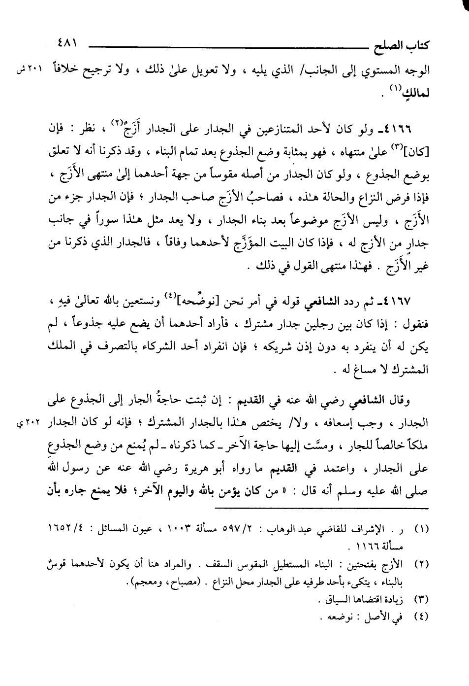 (2) الأزج بفتحتين: البناء المستطيل المقوس السقف. والمراد هنا أن يكون لأحدهما قوسٌ بالبناء، يتكىء بأحد طرفيه على الجدار محل النزاع. (مصباح، ومعجم).