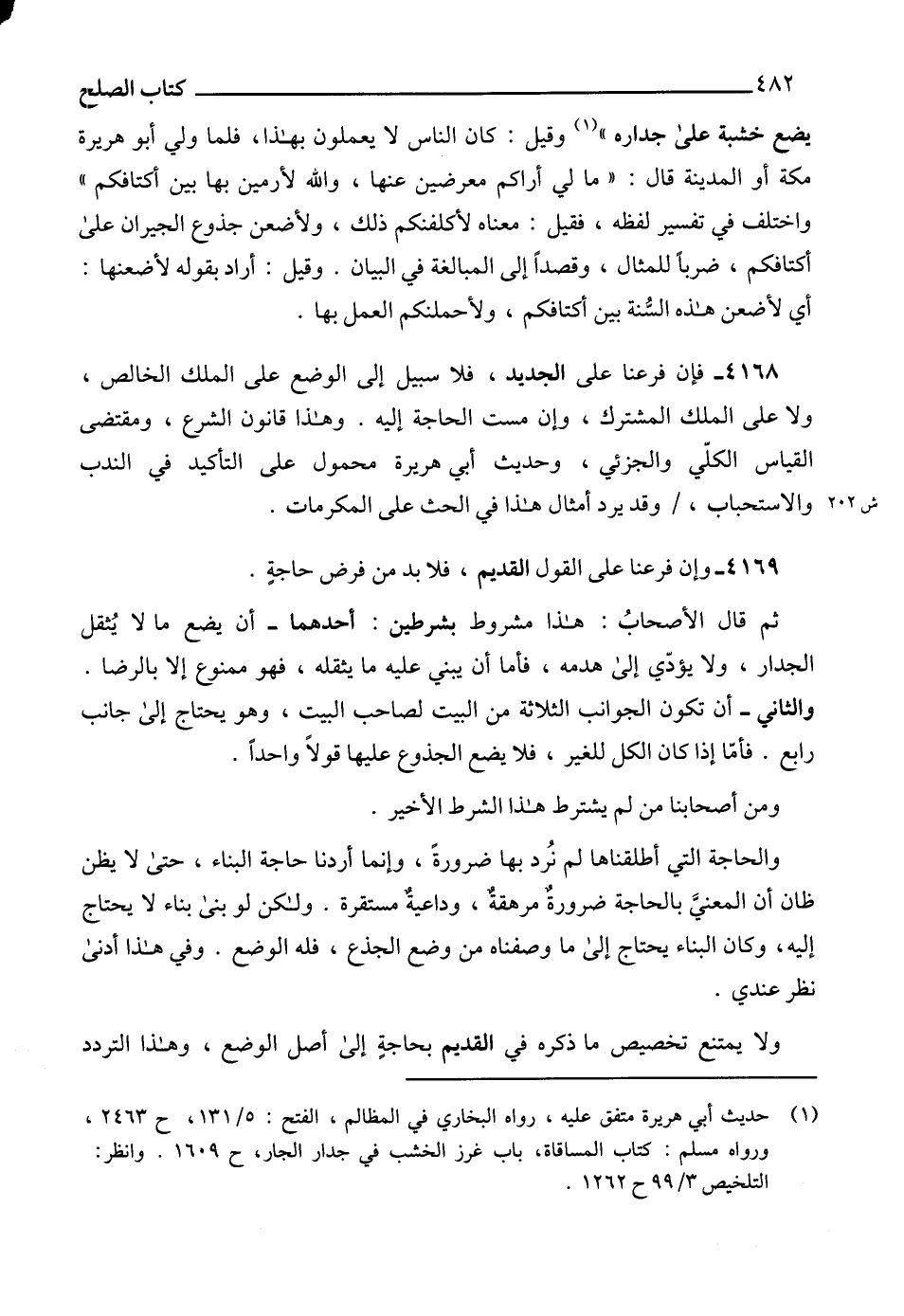 (1) حديث أبي هريرة متفق عليه، رواه البخاري في المظالم، الفتح: 5/ 131، ح 2463، ورواه مسلم: كتاب المساقاة، باب غرز الخشب في جدار الجار، ح 1609. وانظر: التلخيص 3/ 99 ح 1262.