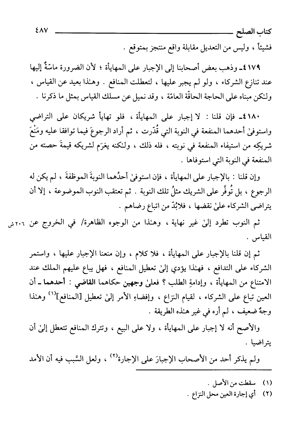 4179 - وذهب بعض أصحابنا إلى الإجبار على المهايأة؛ لأن الضرورة ماسّةٌ إليها عند تنازع الشركاء، ولو لم يجبر عليها، لتعطلت المنافع. وهذا بعيد عن القياس، ولكن مبناه على الحاجة الحاقّة العامّة، وقد نميل عن مسلك القياس بمثل ما ذكرنا.