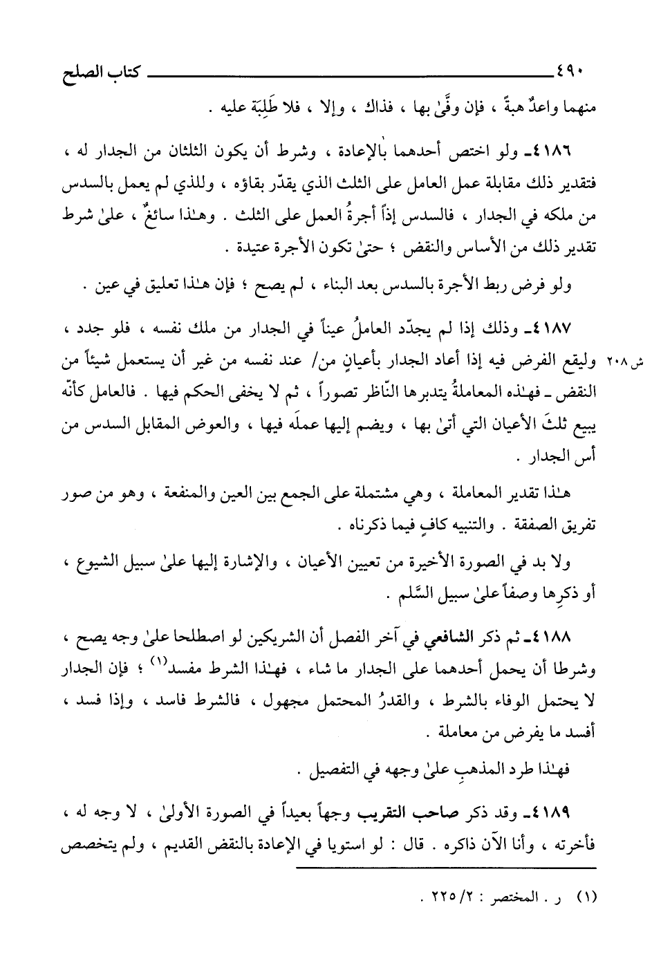 4186 - ولو اختص أحدهما بالإعادة، وشرط أن يكون الثلثان من الجدار له، فتقدير ذلك مقابلة عمل العامل على الثلث الذي يقدّر بقاؤه، وللذي لم يعمل بالسدس من ملكه في الجدار، فالسدس إذاً أجرةُ العمل على الثلث. وهذا سائغٌ، على شرط تقدير ذلك من الأساس والنقض؛ حتى تكون الأجرة عتيدة.