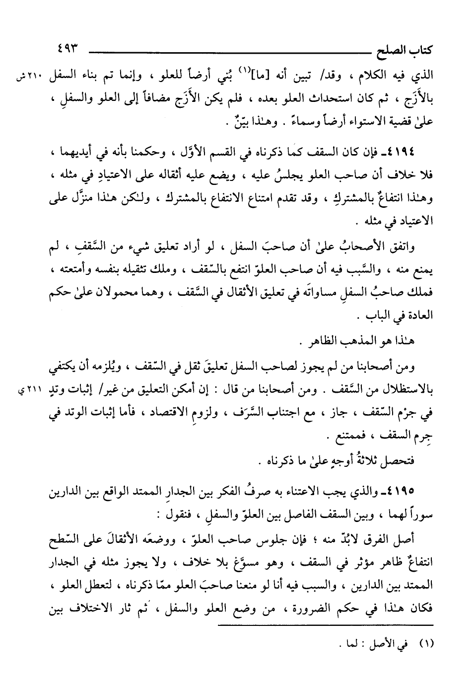 4195 - والذي يجب الاعتناء به صرفُ الفكر بين الجدارِ الممتد الواقع بين الدارين سوراً لهما، وبين السقف الفاصل بين العلوّ والسفلِ، فنقول: