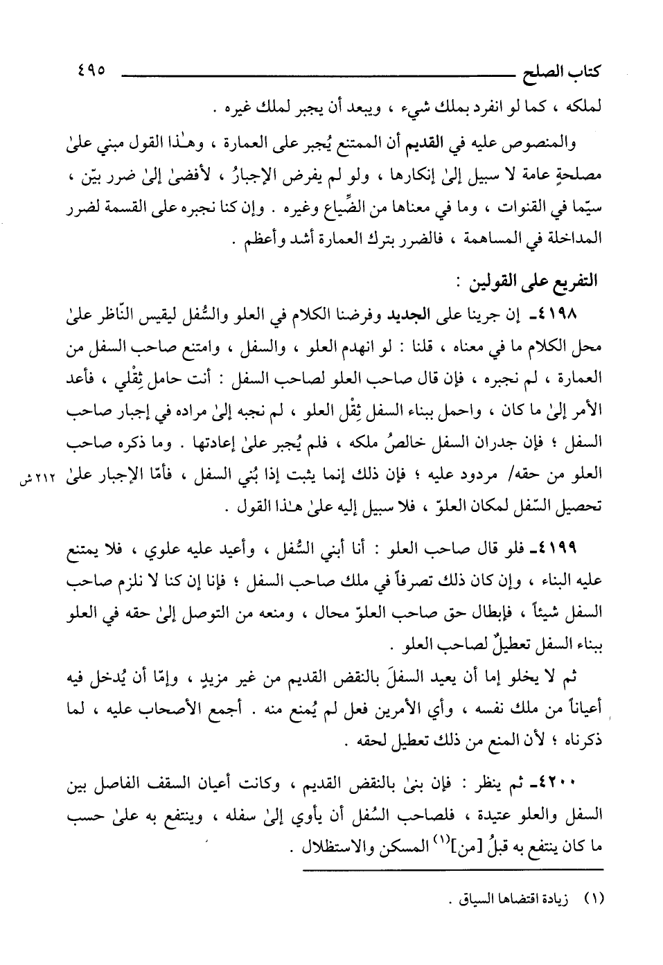4198 - إن جرينا على الجديد وفرضنا الكلام في العلو والسُّفل ليقيس النّاظر على محل الكلام ما في معناه، قلنا: لو انهدم العلو، والسفل، وامتنع صاحب السفل من العمارة، لم نجبره، فإن قال صاحب العلو لصاحب السفل: أنت حامل ثِقْلي، فأعد الأمر إلى ما كان، واحمل ببناء السفل ثِقْل العلو، لم نجبه إلى مراده في إجبار صاحب السفل؛ فإن جدران السفل خالصُ ملكه، فلم يُجبر على إعادتها. وما ذكره صاحب العلو من حقه مردود عليه؛ فإن ذلك إنما يثبت إذا بُني السفل، فأمّا الإجبار على تحصيل السّفل لمكان العلوّ، فلا سبيل إليه على هذا القول.