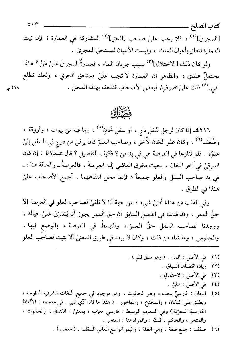 4216 - إذا كان لرجل سُفل دارٍ، أو سفل خَانٍ (5)، وما فيه من بيوت، وأروقة، وصُفَف (6)، وكان علو الخان لآخر، وصاحب العلوّ كان يرقى من درجٍ في السفل إلى علوّه. فلو تنازعا في العرصة هي في يد من؟ فكيف التفصيل؟ قال علماؤنا: إن كان المرقى في آخر الخان، بحيث يخرق الماشي إليه العرصةَ، فالعرصةُ -والحالة هذه- في يد صاحب السفل والعلو جميعاً، فإنها محل انتفاعهما. أجمع الأصحاب على هذا في الطرق.