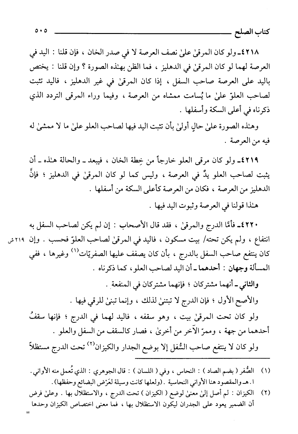 4220 - فأمَّا الدرج والمرقى، فقد قال الأصحاب: إن لم يكن لصاحب السفل به انتفاع، ولم يكن تحته بيت مسكون، فاليد في المرقى لصاحب العلوّ فحسب. وإن كان ينتفع صاحب السفل بالدرج، بأن كان يصفف عليها الصفريّات (1) وغيرها، ففي المسألة وجهان: أحدهما - أن اليد لصاحب العلو، كما ذكرناه.