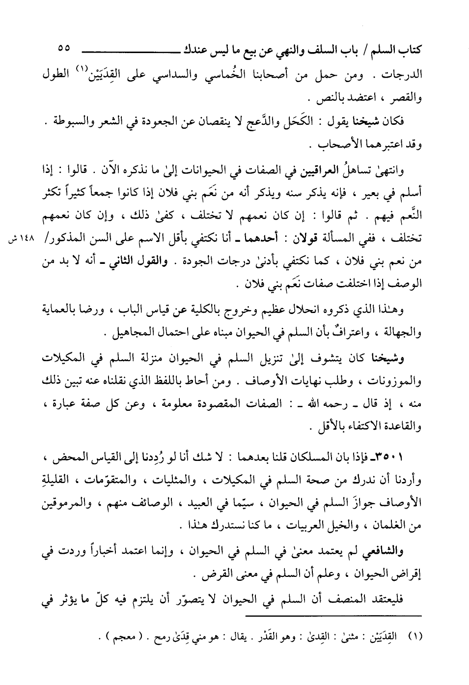 وشيخنا كان يتشوف إلى تنزيل السلم في الحيوان منزلة السلم في المكيلات والموزونات، وطلب نهايات الأوصاف. ومن أحاط باللفظ الذي نقلناه عنه تبين ذلك منه، إذ قال -رحمه الله-: الصفات المقصودة معلومة، وعن كل صفة عبارة، والقاعدة الاكتفاء بالأقل.