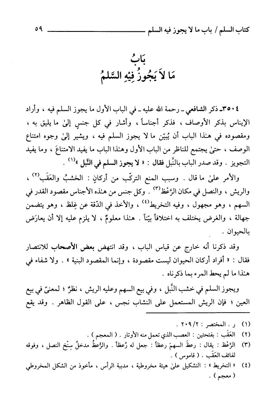 3504 - ذكر الشافعي -رحمة الله عليه- في الباب الأول ما يجوز السلم فيه، وأراد الإيناس بذكر الأوصاف، فذكر أجناساً، وأشار في كل جنسٍ إلى ما يليق به، ومقصوده في هذا الباب أن يُبيّن ما لا يجوز السلم فيه، ويشير إلى وجوه امتناع الوصف، حتى يجتمع للناظر من الباب الأول وهذا الباب ما يفيد الامتناعَ، وما يفيد التجويز. وقد صدر الباب بالنَّبل فقال: " لا يجوز السلم في النَّبل " (1).