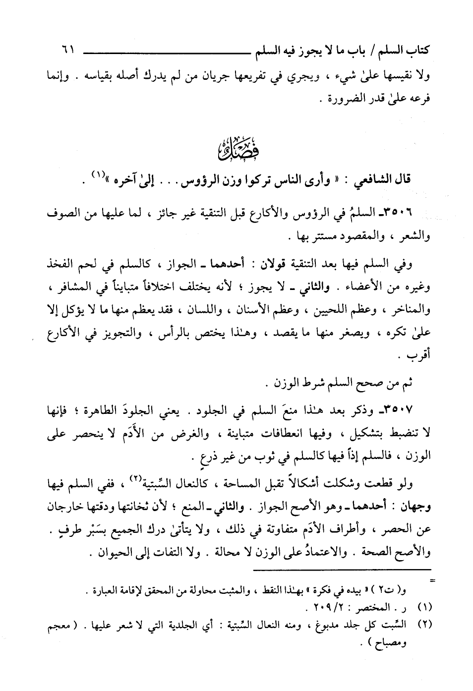 3506 - السلمُ في الرؤوس والأكارع قبل التنقية غير جائز، لما عليها من الصوف والشعر، والمقصود مستتر بها.