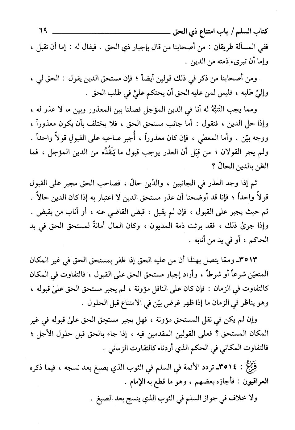 3514 - تردد الأئمة في السلم في الثوب الذي يصبغ بعد نسجه، فيما ذكره العراقيون: فأجازه بعضهم، وهو ما قطع به الإمام.