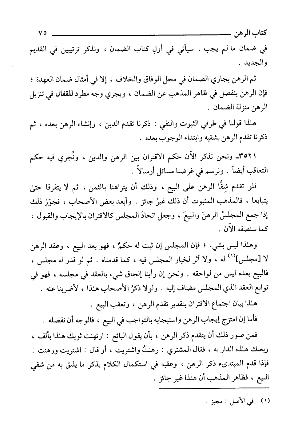 3521 - ونحن نذكر الآن حكم الاقتران بين الرهن والدين، ونُجري فيه حكم التعاقب أيضاًً. ونرسم في غرضنا مسائل أرسالاً.
