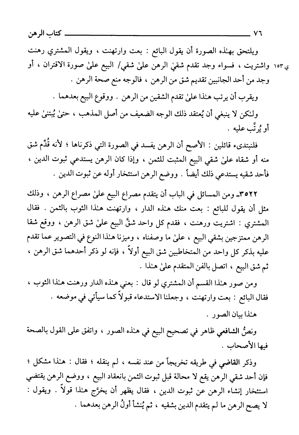 3522 - ومن المسائل في الباب أن يتقدم مصراع البيع على مصراع الرهن، وذلك مثل أن يقول للبائع: بعت منك هذه الدار، وارتهنت هذا الثوب بالثمن. فقال المشتري: اشتريت ورهنت، فقدم كل واحد شقَّ البيع على شق الرهن، ووقع شقا الرهن ممتزجين بشقي البيع، على ما وصفناه، وميزنا هذا النوع في التصوير عما تقدم عليه بذكر كل واحد من المتخاطبين شق البيع أولاً، فإنه لو ذكر أحدهما شق الرهن، ثم شق البيع، اتصل بالفن المتقدم على هذا.