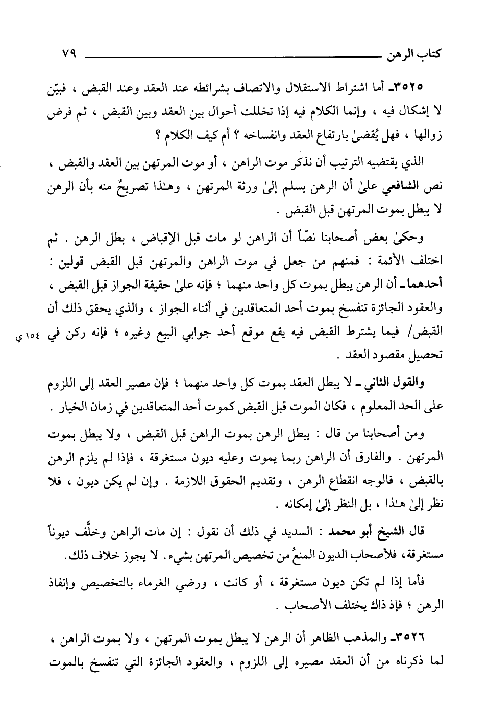 3526 - والمذهب الظاهر أن الرهن لا يبطل بموت المرتهن، ولا بموت الراهن، لما ذكرناه من أن العقد مصيره إلى اللزوم، والعقود الجائزة التي تنفسخ بالموت