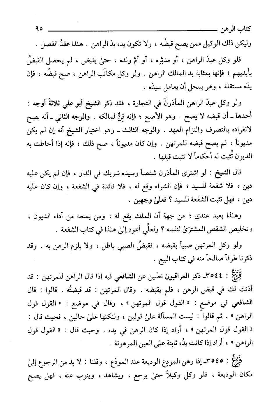 3544 - ذكر العراقيون نصّين عن الشافعي فيه إذا قال الراهن للمرتهن: قد أذنت لك في قبض الرهن، فلم يقبضه. وقال المرتهن: قد قبضتُه. قالوا: قال الشافعي في موضعٍ " القول قول المرتهن "، وقال في موضع: " القول قول الراهن ". ثم قالوا: ليست المسألة على قولين، ولكنها على حالين، فحيث قال: " القول قول المرتهن "، أراد إذا كان الرهن في يده. وحيث قال: " القول قول الراهن "، أراد إذا كانت يدُه ثابتة على العين المرهونة.