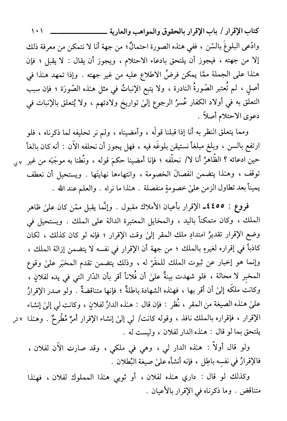 4455 - الإقرار بأعيان الأملاك مقبول. وإنَّما يقبل ممّن كان على ظاهر الملك، وكان متمكناً باليد، والمخايل المعتبرة الدالة على الملك. ويستحيل في وضع الإقرار تقديرُ امتدادِ ملك المقر إلى وقت الإقرار؛ فإنه لو كان كذلك، لكان كاذباً في إقراره لغيرهِ بالملك؛ من جهة أن الإقرار في نفسه لا يتضمن إزالة الملك، وإنما هو إخبار عن ثبوت الملك للمقَرّ له، وذلك يتضمن تقدم المخبَر على وقوع المخبِر لا محالة، فلو شهدت بينةٌ على أن فُلاناً أقر بأن الدّار التي في يده لفلانٍ، وكانت ملكَه إلى أن أقر بها، فهذه الشهادة باطلةٌ؛ فإنها متناقضةٌ. ولو صدر الإقرارُ على هذه الصيغة من المقر، نُظر: فإن قال: هذه الدارُ لفلانٍ، وكانت لي إلى إنشاء الإقرار، فإقراره بالملك نافذ، وقوله كانت لي إلى إنشاء الإقرار أمرٌ مُطّرحٌ. وهذا يلتحق بما لو قال: هذه الدار لفلان، وليست له.