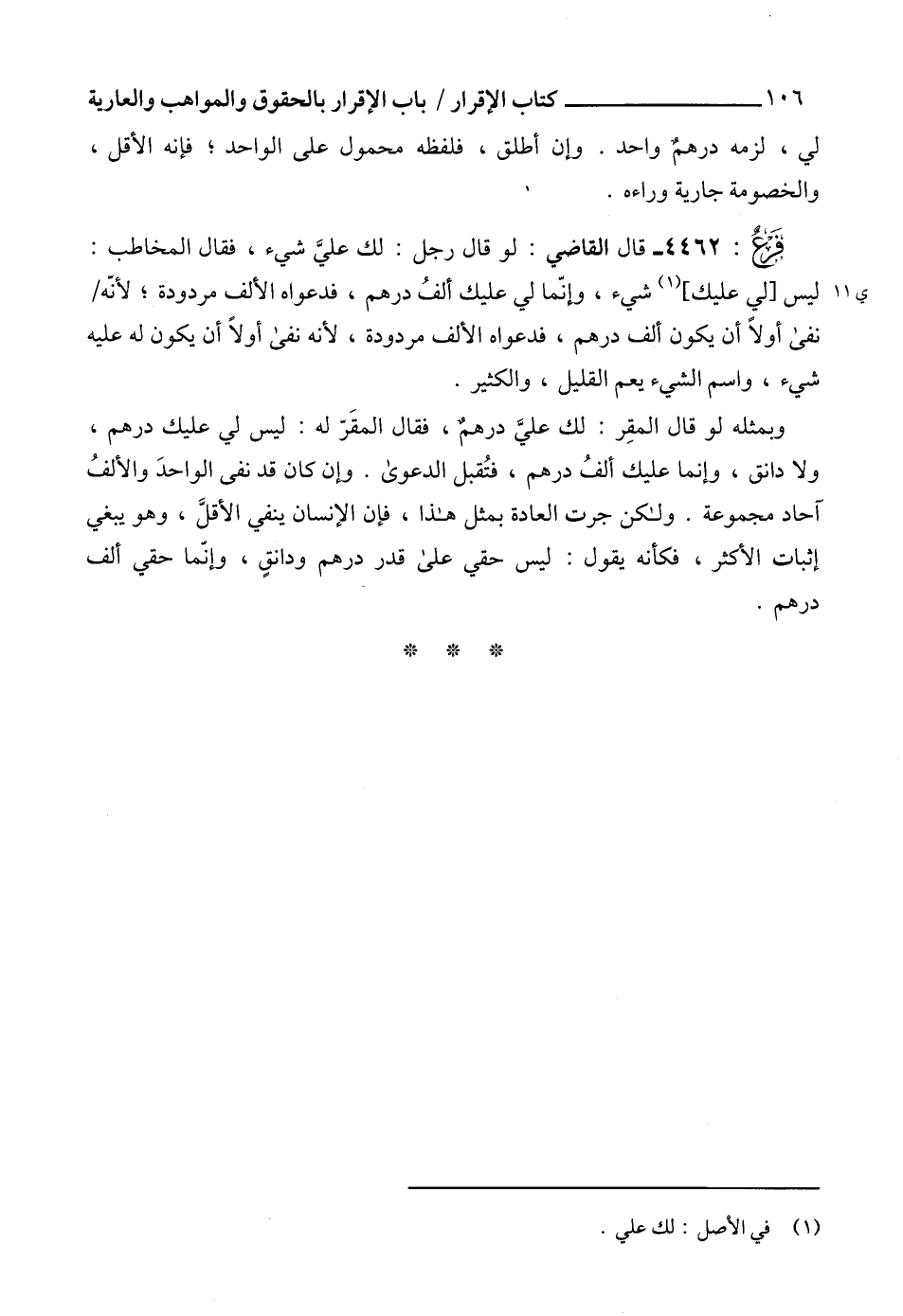 4462 - قال القاضي: لو قال رجل: لك عليَّ شيء، فقال المخاطب: