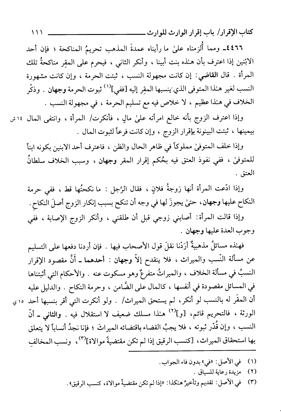 فهذه مسائلُ مذهبيةٌ أرَدْنا نقلَ قول الأصحاب فيها. فإن أردنا دفعها على التسليم عن مسألة النّسب والميراث، فلا ينقدح إلاّ وجهان: أحدهما- أَنَّ مقصود الإقرار النسبُ في مسألة الخلاف، والميراثُ متفرعٌ وهو مسكوت عنه. والأحكام التي أثبتناها في المسائل مقصودة في أنفسها، كالمال على الضَّامن، وحرمة النكاح. والدليل عليه أن المقَر له بالنسب لو أنكر، لم يستحق الميراث. ولو أنكرت التي أقر بنسبها أحد الورثة، فالتحريم قائم، [و] (2) هذا مسلك ضعيف لا استقلال فيه. والثاني - أنّ النسب، وإن قُدّر ثبوته، فلا يجبُ القضاء باقتضائه الميراثَ؛ فإنا نجدُ أنساباً لا يتعلق بها استحقاق الميراث، [كنسب الرقيق إذا لم تكن مقتضيةً موالاة] (3)، ونسب المخالفِ