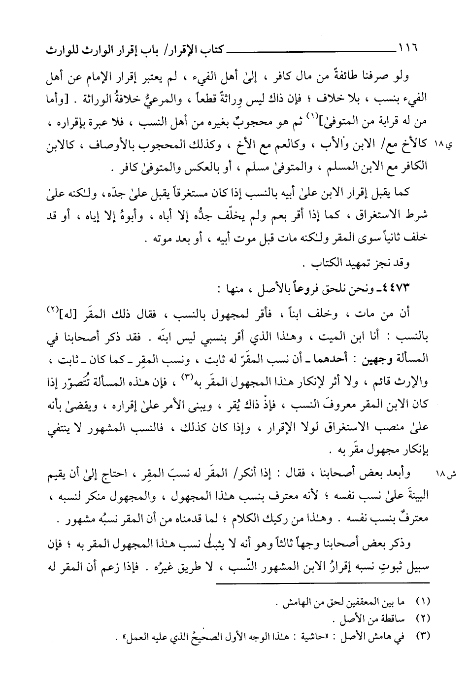 ولو صرفنا طائفةً من مال كافر، إلى أهل الفيء، لم يعتبر إقرار الإمام عن أهل الفيء بنسب، بلا خلاف؛ فإن ذاك ليس وِراثةً قطعاً، والمرعيُّ خلافةُ الوراثة. [وأما من له قرابة من المتوفى] (1) ثم هو محجوبٌ بغيره من أهل النسب، فلا عبرة بإقراره، كالأخ مع الابن والأب، وكالعم مع الأخ، وكذلك المحجوب بالأوصاف، كالابن الكافر مع الابن المسلم، والمتوفى مسلم، أو بالعكس والمتوفى كافر.