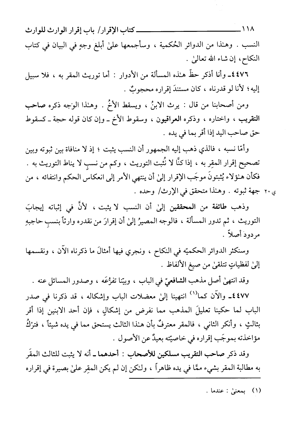4476 - وأنا أذكر حظّ هذه المسألة من الأدوار: أما توريث المقر به، فلا سبيل إليه؛ لأنا لو قدرناه، كان مستندَ إقراره محجوبٌ.